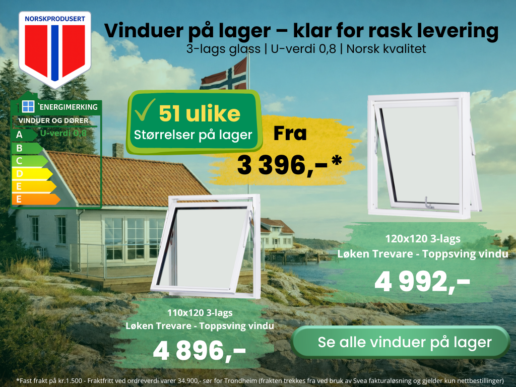 Toppsving vindu passer godt for boliger som ønsker lav U-verdi, enkel lufting og et praktisk vindu som er lett å vaske. Hos Vindu Butikken finner du 3-lags toppsving vinduer med U-verdi 0,8, NDVK-dokumentasjon, rask levering og levering over hele Norge.