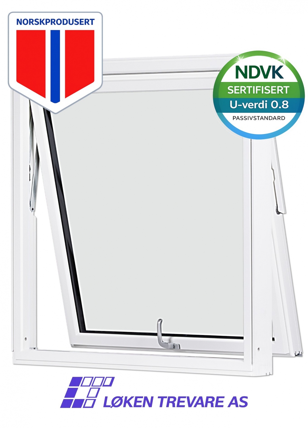 Rømningsvindu. PVC vindu 2-veis hvit 3-lags glass. Høyre hengslet sett fra innsiden Innadslående med lufting inn i topp og sideveis høyre hengslet Inkl håndtak NDVK sertifisert