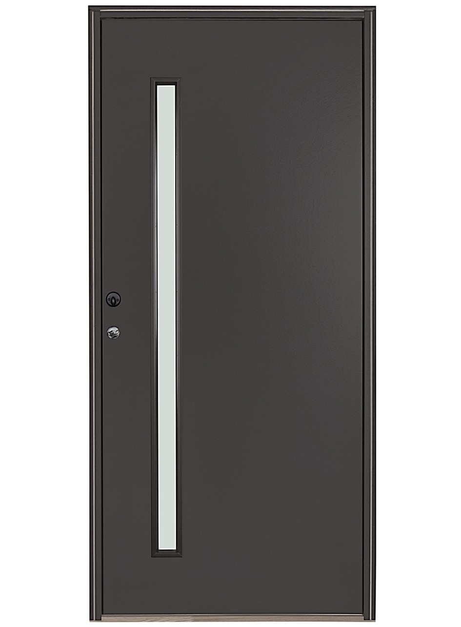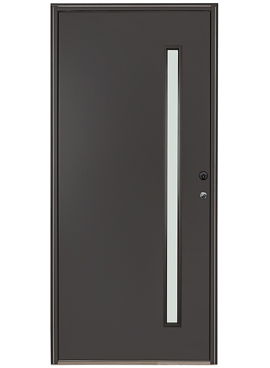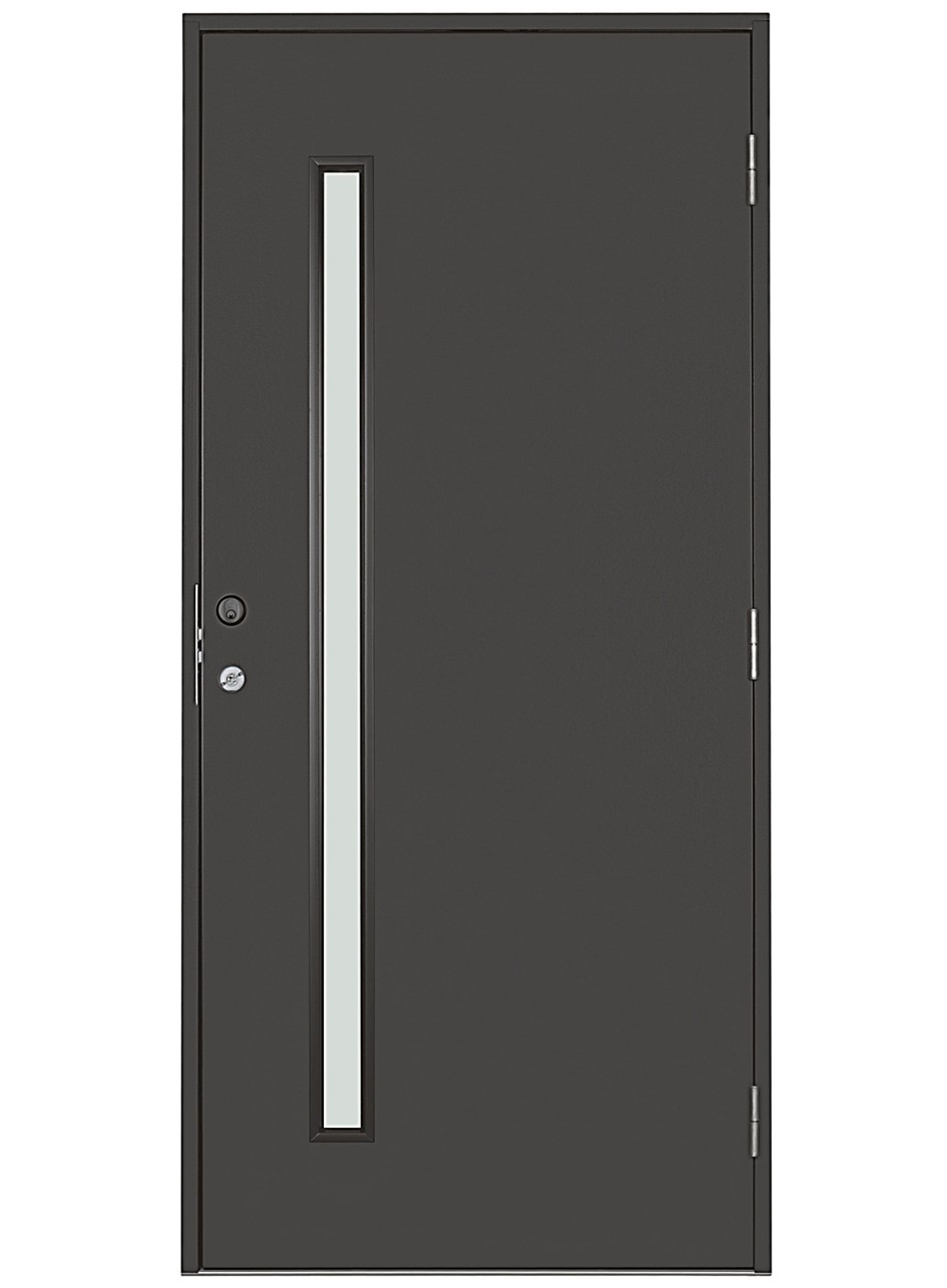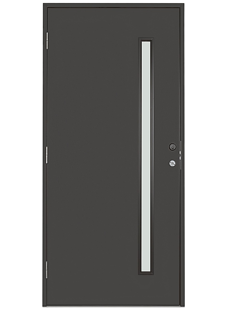 Ytterdør i høy kvalitet malt i dempet sort NCS S8500N Klart glass, U-verdi 0,97 W/m², Alle mål er oppgitt i bredde x høyde Utvendig karmmål: 990x2090mm