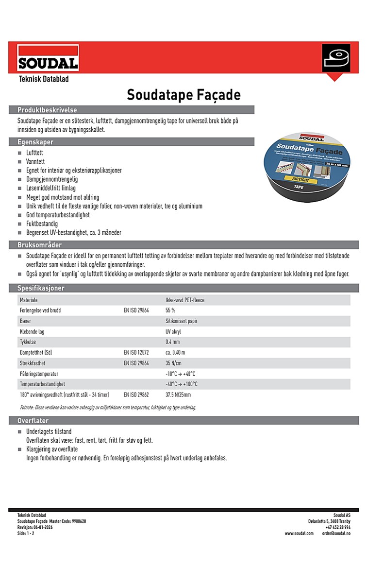 Soudatape Façade er ideell for permanent lufttett tetning av forbindelser mellom trepaneler og overganger med tilstøtende glatte overflater som vinduer, i tak og / eller luker samt andre penetrasjoner utvendig på bygningskropp.