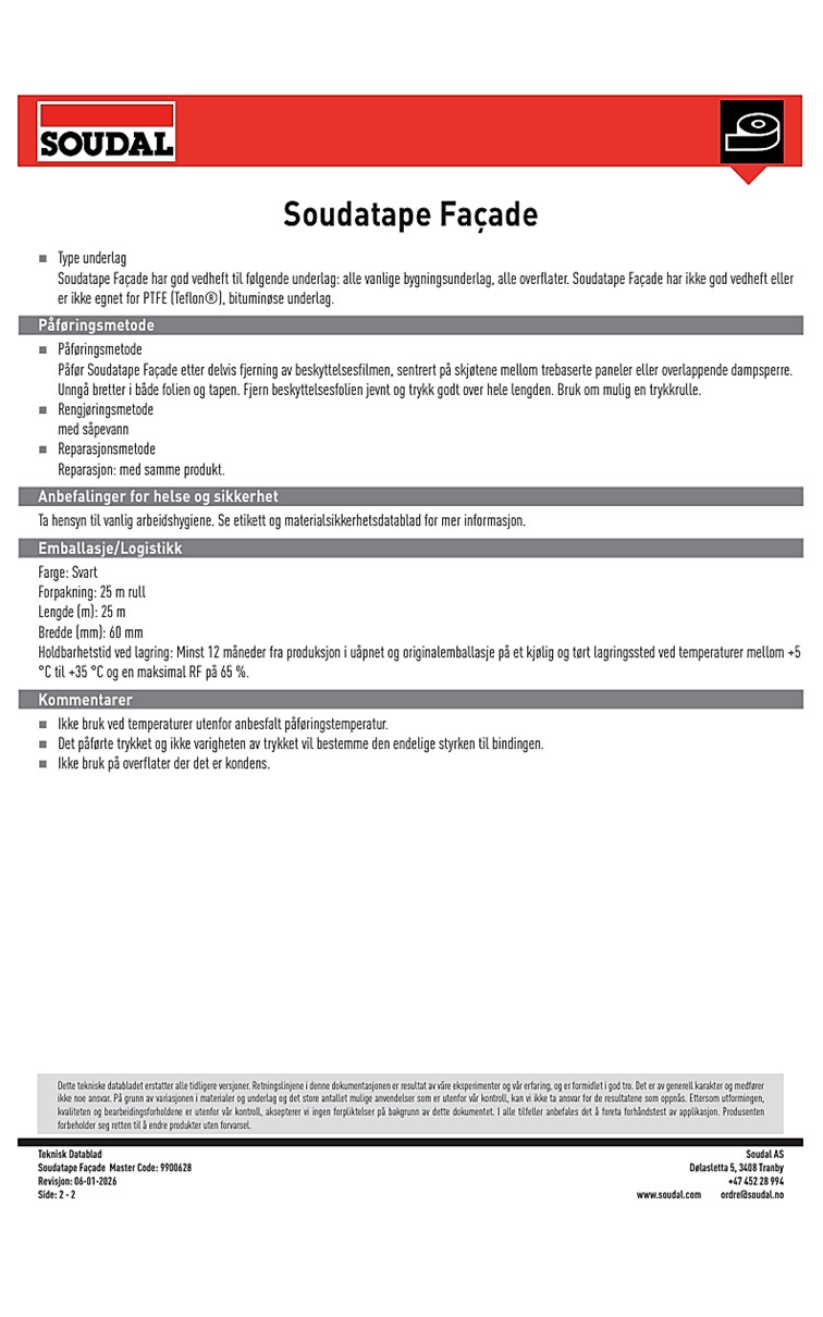 Soudatape Façade er ideell for permanent lufttett tetning av forbindelser mellom trepaneler og overganger med tilstøtende glatte overflater som vinduer, i tak og / eller luker samt andre penetrasjoner utvendig på bygningskropp.