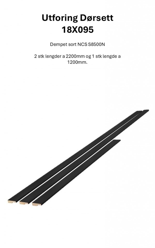 Standard anslag Flat underliggende Flat mellomliggende Karmlist dørsett 12x58mm dempet sort - begge sider Utforing Dørsett 18X045 Dempet Sort S8500N Utforing Dørsett 18X070 Dempet Sort S8500N Utforing Dørsett 18X095 Dempet Sort S8500N 8pk justeringskruer Dyttestrimmel 1pk 60X22mm, 15m Trekile 20pk Karmpakke 90x190 m/dempelist Dempet sort S8500N Karmsett med dempelist for en bedre lydtetthet og hindrer slingring ved gjennomtrekk. Karmmål: Modul 90x190cm - nøyaktig karmmål 89x189cm - til dørblad 82,5x184cm PrisNOK1 395,00 inkl. mva. På lager TERSKELVELG TERSKEL TIL DIN KARM HERStandard anslagFlat underliggende Flat mellomliggendeKarm leveres uten terskel -169,00KARMLIST DØRSETT VELGKarmlist dørsett 12x58mm dempet sort - begge sider +518,00UTFORING DØRSETTVELGUtforing Dørsett 18X045 Dempet Sort S8500N +349,00Utforing Dørsett 18X070 Dempet Sort S8500N +395,00Utforing Dørsett 18X095 Dempet Sort S8500N +499,00JUSTERING- OG MONTERINGSKRUEVELG8pk justeringskruer +129,00DYTTESTRIMMEL 1PK 15M VELGDyttestrimmel 1pk 60X22mm, 15m +129,00KILER VELGTrekile 20pk +79,00 Antall Vil du ta i bruk dette valget? Ja Nei Kjøp Ønskeliste Vipps hurtigkasseKjøp nå med Vipps hurtigkasse Artikkelnr.: KPSD919 Del dette Produktinfo Produktanmeldelser (0) Karmmål: Modul 90x190cm - nøyaktig karmmål 89x189cm - til dørblad 82,5x184cm Karmbredde/dybde: 92mm Hengsler: snap-in 2stk sort Sluttstykket: sort Pakning: Toppstykket og sidevanger i sort Terskel: Anslag, flat underliggende eller flat mellomliggende Forborret: 14mm Fargekode: NCS S8500N dempet sort Glans: 30 +/- 5 Notspor: Topp og sidevanger Karmsett i Dempet Sort med Sort Pakning – NCS S 8500-N Gi hjemmet ditt et moderne og sofistikert uttrykk med dette karmsettet i dempet sort. Med en stilren farge og praktiske detaljer er dette karmsettet utviklet for å passe både funksjonelle og estetiske behov i dagens interiør. Produktfordeler: Stilren fargenyanse: Den dempede sorte overflaten (NCS S 8500-N) gir karmen et eksklusivt preg som smelter naturlig inn i både minimalistiske og mer tradisjonelle rom. Effektiv tetning: Inkludert sort pakning bidrar til bedre lydisolasjon og reduserer trekk, som gir økt komfort og energieffektivitet i boligen. Fleksible terskelalternativer: Velg mellom lav terskel på 9mm/14mm for en mer tilgjengelig løsning, eller en klassisk 22mm terskel – perfekt til ulike bruksområder og gulvhøyder. Standard karmbredde: Med 92 mm bredde passer dette karmsettet til de fleste standard døråpninger og gir god stabilitet og støtte til døren. Robust kvalitet: Produsert av solide materialer som sikrer lang holdbarhet og pålitelig bruk over tid. Brukervennlig montering: Karmsettet er designet med tanke på enkel installasjon, slik at det raskt og effektivt kan settes på plass. Dette karmsettet i dempet sort kombinerer estetisk eleganse med praktiske funksjoner, og er et ideelt valg for deg som ønsker et helhetlig og moderne uttrykk i hjemmets dørmiljøer. Enkeldører Modul Dørbladmål Karmyttermål Veggåpning 7 x 20 62,5 x 194cm 69 x 199cm 71 x 201cm 8 x 20 72,5 x 194cm 79 x 199cm 81 x 201cm 9 x 20 82,5 x 194cm 89 x 199cm 91 x 201cm 10 x 20 92,5 x 194cm 99 x 199cm 101 x 201cm 7 x 21 62,5 x 204cm 69 x 209cm 71 x 211cm 8 x 21 72,5 x 204cm 79 x 209cm 81 x 211cm 9 x 21 82,5 x 204cm 89 x 209cm 91 x 211cm 10 x 21 92,5 x 204cm 99 x 209cm 101 x 211cm Skriv en produktanmeldelse og del dine erfaringer med dette produktet med andre kunder. Email Navn Din vurdering? 1 star 2 star 3 star 4 star 5 star 6 star Oppgi en tittel for anmeldelsen din Skriv inn produktanmeldelsen i feltet under